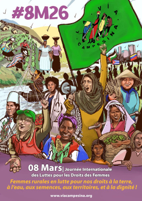 Bagnolet, 18 février 2026) En ce 8 mars, Journée internationale des luttes pour les droits des femmes, en tant que femmes rurales, autochtones, afro-descendantes, pêcheuses artisanales, éleveuses, travailleuses rurales et personnes de genre divers des communautés rurales, nous élevons nos voix depuis tous les territoires du monde contre l’impérialisme, le fascisme, le racisme et les reculs des droits historiques. Nous disons non à la violence structurelle, à la dépossession, aux déplacements forcés et aux féminicides. Nous voulons vivre !