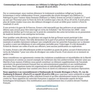 « Nous voulons dénoncer le traitement scandaleux infligé par la police britannique à notre collaborateur », écrivent les éditions La Fabrique, dans un communiqué diffusé ce mardi matin. L’entreprise réagit ainsi à l’arrestation la veille d’Ernest, l’un de ses collaborateurs en charge des droits étrangers, par les autorités britanniques à la gare Saint-Pancras de Londres. (...)