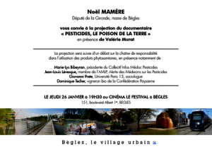 à 19h30 au cinéma Le Festival à BEGLES, Noël MAMERE vous convie à la projection du documentaire « Pesticides, le poison de la terre » en présence de Valérie MURAT.
