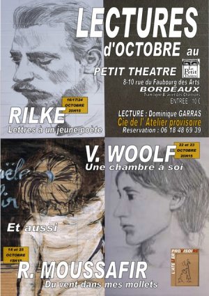 Reiner Maria Rilke, Virginia Woolf et Raphaele Moussafir vont raisonner en ce mois d’Octobre, au plein coeur de Novart...La Compagnie de L’Atelier Provisoire, juste sortie de sa dernière création " Les Gens" -fantaisie déjantée autour des"Petits outrages" de Claude Bourgeyx- vient honorer l’invitation du maître des lieux Eric Sanson. Les deux compagnies ont en commun l’amour du texte , l’exigence du travail et la gourmandise de la rencontre avec le public .