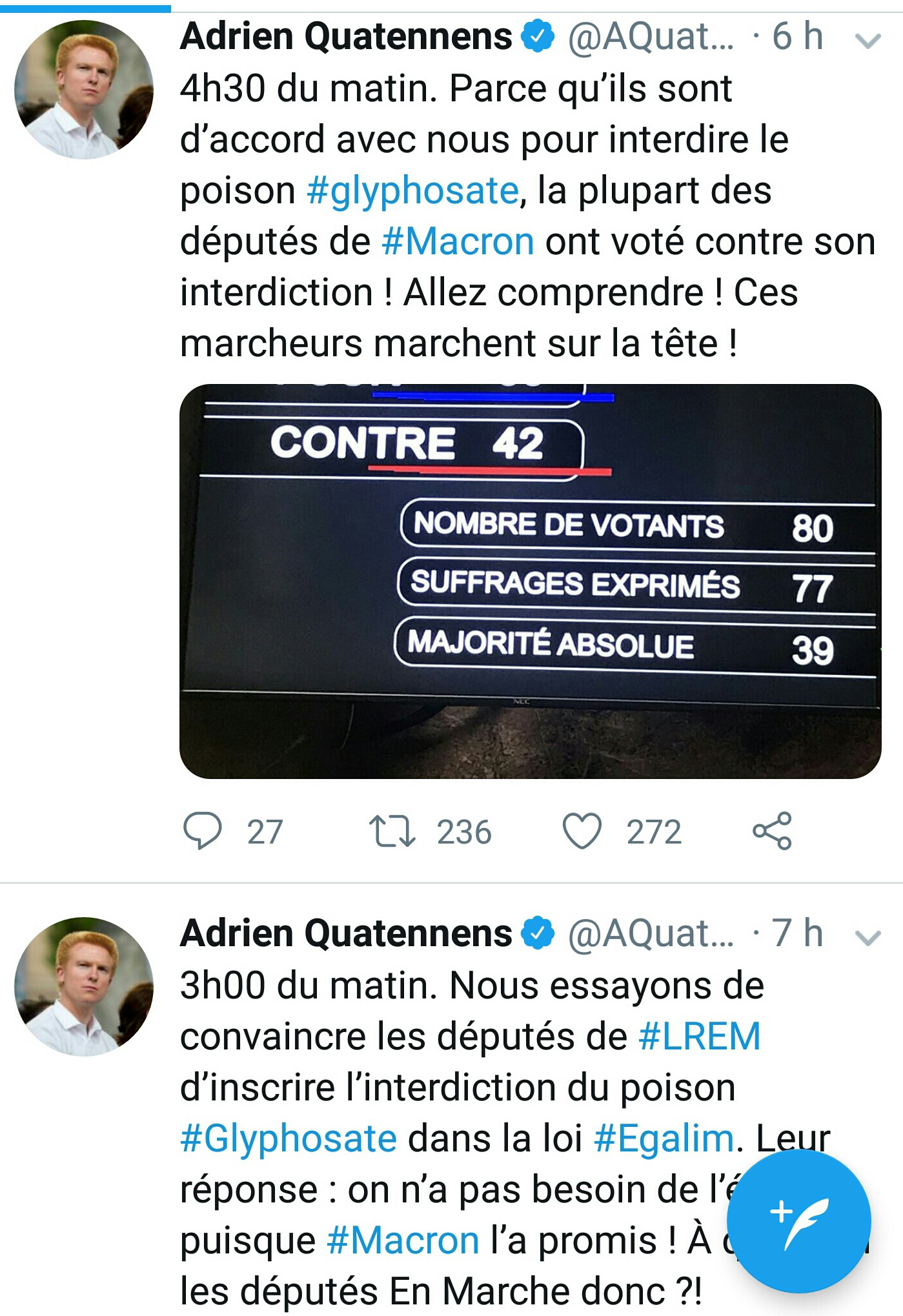 Lamentable vote à 4h20 du matin à l’issue d’un long débat où une fois de plus la majorité parlementaire rejette l’inscription dans la loi l’interdiction effective du glyphosate.