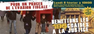 Le lundi 8 février 2016 au matin s’ouvre au Palais de justice de Paris le procès de Jérôme Cahuzac, ministre du Budget et fraudeur fiscal. Les faucheurs de chaises s’inviteront à l’audience pour remettre à la Justice 196 chaises prélevées dans des agences de banques qui organisent l’évasion fiscale. Nous dirons de cette manière aux pouvoirs publics : poursuivre les faucheurs de chaises, ça suffit ! Juger Cahuzac c’est bien, pénaliser aussi l’évasion fiscale organisée par les banques ce serait mieux !