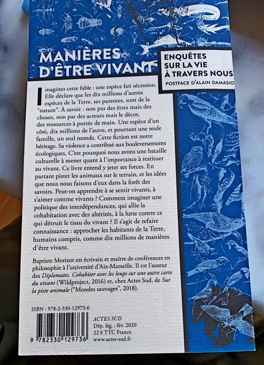 (...) Dans cet essai, le philosophe Baptiste Morizot part de son expérience de terrain comme pisteur de loups dans les montagnes françaises [ici, Vercors et Pyrénées] pour développer sa pensée philosophique, nous incitant à revoir notre manière d’être au monde, en relation avec les autres êtres vivants.
