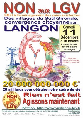 A l’occasion de la journée européenne d’action contre les LGV, de tout le Sud-Gironde, de nombreux cortèges vont converger vers Langon pour exprimer le mécontentement d’une population qui se sent oubliée et sacrifiée au profit d’intérêts particuliers.