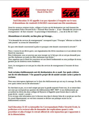 Sud Education 31-65 appelle à ne pas répondre à l’enquête sur le taux d’absentéisme du vendredi 21/04/2023 concernant une fête musulmane.