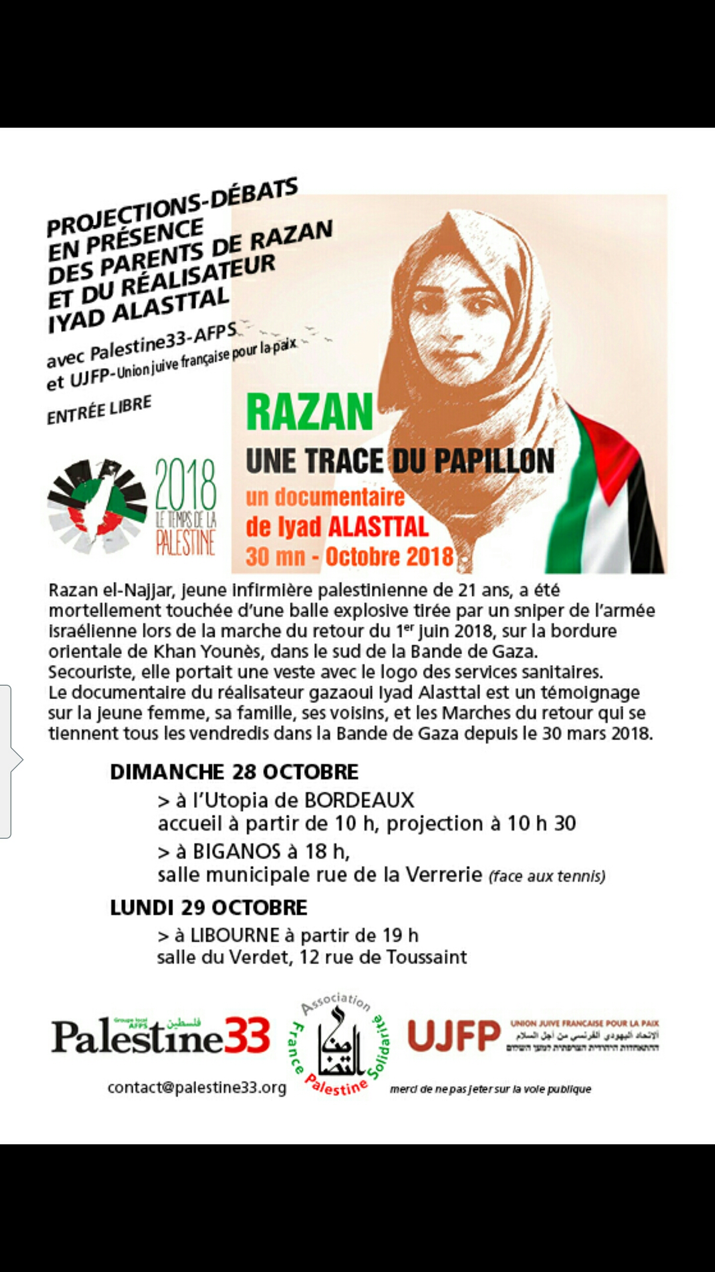 Du 9 octobre au 9 novembre 2018, Iyad Alasttal et les parents de Razan accompagneront le film dans une grande tournée dans toutes les régions de France. Cette tournée est organisée par les associations de solidarité avec la Palestine, AFPS, UJFP, BDS, Coordination des associations Palestiniennes à Paris, Association des Palestiniens en France Aljaliya.