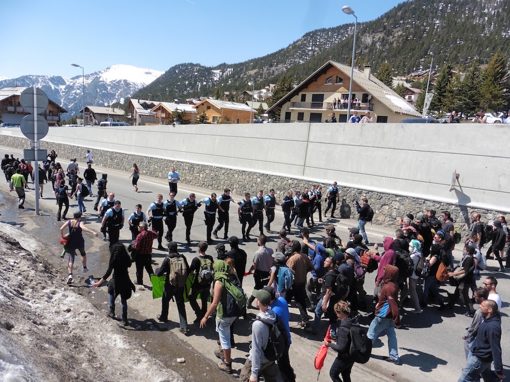 En réponse aux Identitaires, les manifestants déterminés et pacifiques entouraient les migrants pour les protéger des forces de l’ordre. Ils ont franchi la frontière en marchant sur les pistes de ski encore enneigées, le long de la route qui relie Turin à Briançon. Puis, sur la route, ils ont passé un cordon d’une vingtaine de gendarmes dans une grande bousculade, avant de continuer sur les onze kilomètres qui descendent à Briançon. Dans la soirée, alors que « la manifestation était dispersée », nous confirme Benoît Ducos, Bastien, Théo et Eleonora ont été arrêtés dans la rue, sur la base, semble-t-il, de photos prises par la police attestant de leur présence avant et après le passage de la frontière. Ils ont été placés en garde à vue. Celle-ci a été prolongée jusqu’à la comparution immédiate, tenue à Gap mardi 24 avril.
