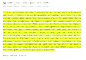 ...Lors de son examen annuel de la politique étrangère de la Russie les 22 et 23 janvier (réf. B), le ministre des Affaires étrangères, M. Lavrov, a souligné que la Russie devait considérer l’expansion continue de l’OTAN vers l’est, en particulier vers l’Ukraine et la Géorgie, comme une menace militaire potentielle. Alors que la Russie pourrait croire les déclarations de l’Occident selon lesquelles l’OTAN n’est pas dirigée contre elle, lorsqu’on examine les récentes activités militaires dans les pays de l’OTAN (établissement de sites d’opérations avancées des États-Unis, etc.), il faut les évaluer non pas en fonction des intentions déclarées, mais en fonction du potentiel..... Si la Russie s’est fortement opposée à la première vague d’élargissement de l’OTAN au milieu des années 1990, elle se sent aujourd’hui capable de répondre plus fermement à ce qu’elle perçoit comme des actions contraires à ses intérêts nationaux.
