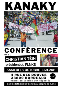 Le collectif girondin de solidarité avec la lutte du peuple kanak a le plaisir de vous inviter le 18 octobre 2025, à Bordeaux, à la Conférence de Christian Téin, président du FLNKS.