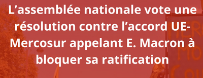 Ce jeudi 27 novembre, les députés ont voté à la très grande majorité une résolution « invitant le Gouvernement de la République française à s’opposer à l’adoption de l’accord commercial entre l’Union européenne et le Mercosur » (1). A l’heure où E. Macron se dit désormais « positif » sur l’accord UE-Mercosur, le collectif national Stop-Mercosur se félicite de ce message simple, ferme et clair : la France peut et doit construire une minorité de blocage au sein de l’UE pour bloquer la ratification de cet accord de libre-échange, le plus nocif mais aussi le plus contesté de l’histoire de la construction européenne.