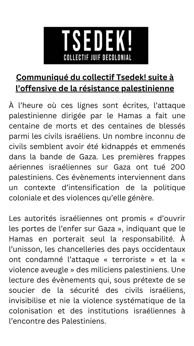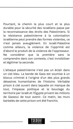 Plusieurs milliers de roquettes ont été tirées sur Israël samedi matin, et des combattants du Hamas ont pénétré sur le territoire. Ils étaient encore « des centaines » dans la soirée. L’État hébreu a engagé ses troupes en réponse. Les bilans provisoires font état d’au moins 250 morts israéliens et 200 victimes palestiniennes. Le Hamas détient des otages israéliens.