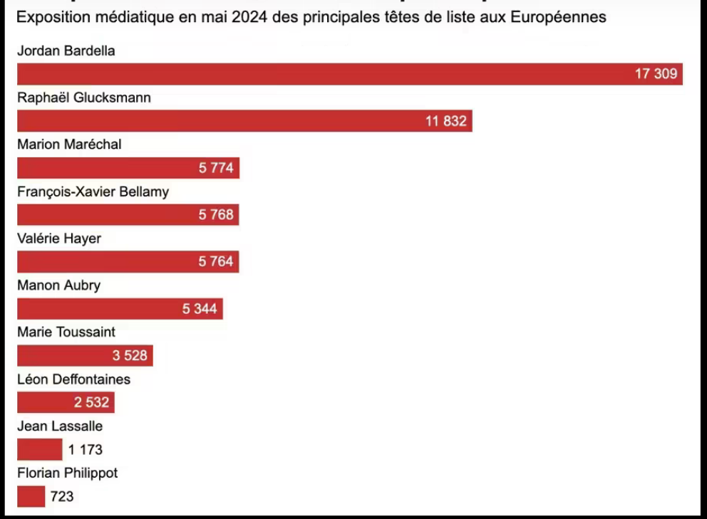 Ce qu’il y a de troublant dans cette étude, c’est l’ordre des candidats. Les médias publics et privés ont quasiment réussi à imposer, dans l’ordre, les résultats des élections. Avec une telle couverture, Bardella ne pouvait qu’être premier. Un paillasson aurait eu le même résultat.