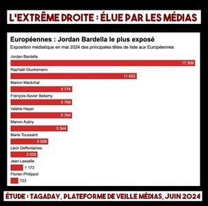 Sans surprise, et de très loin, c’est l’extrême droite de Bardella qui est la plus « exposée », avec 17.309 mentions. Un endoctrinement massif, implacable.