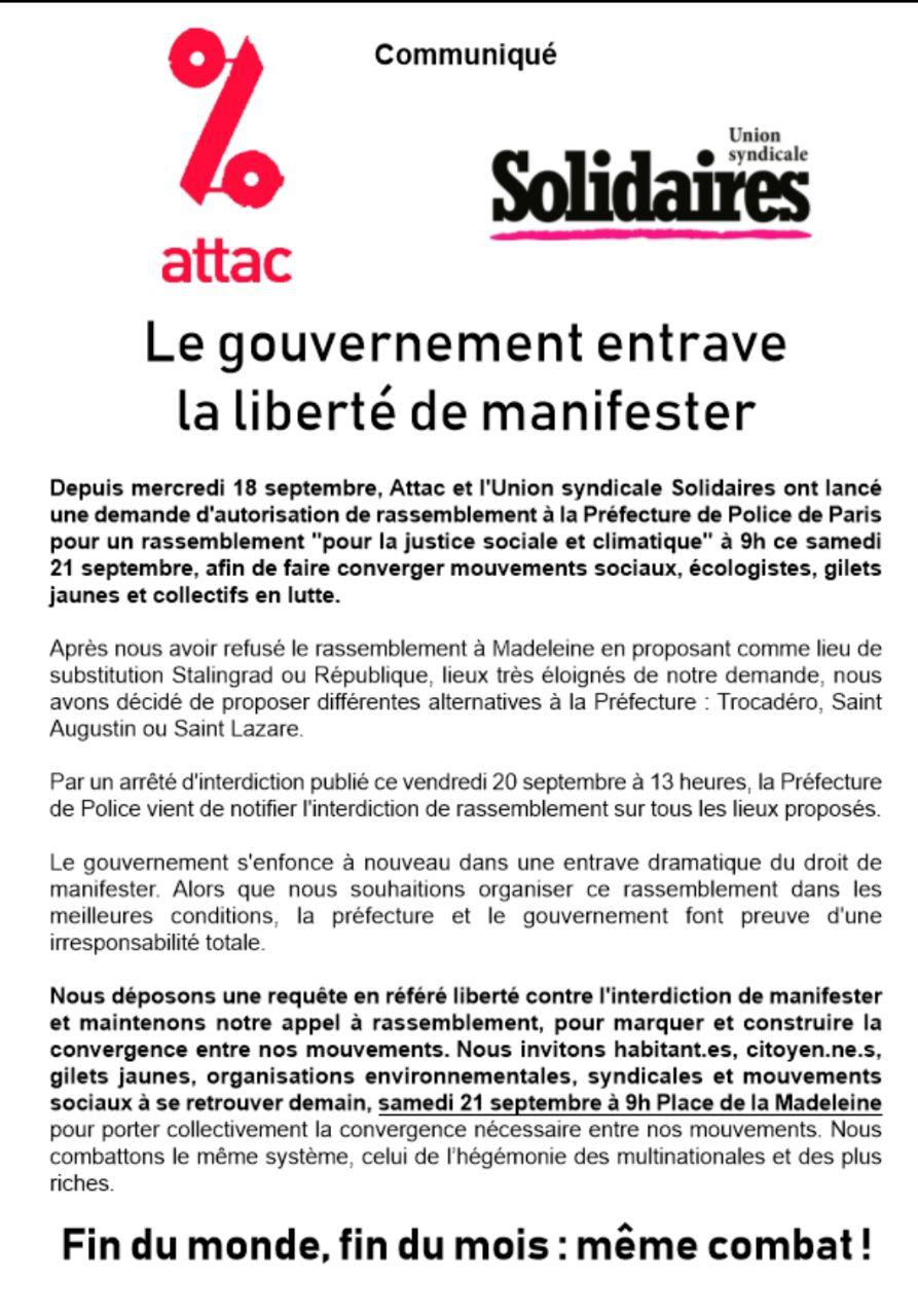 L’association Attac et le syndicat Solidaires ont décidé de maintenir leur appel à rassemblement, samedi 21 septembre au matin à Paris place de la Madeleine, malgré une interdiction de la Préfecture de police de Paris. Les organisateurs dénoncent une entrave à la liberté de manifester. (...)