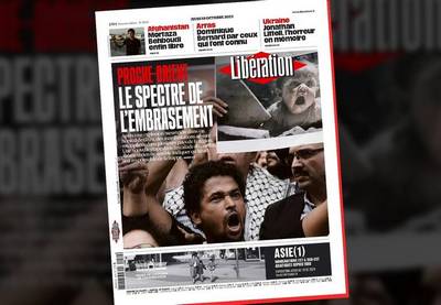 Libé consacrait ce jour son événement (le dossier qui ouvre le quotidien) aux manifestations dans les pays arabes consécutives à l’explosion survenue dans l’hôpital gazaoui Al-Ahli Arabi. La une était titrée « Proche Orient, le spectre de l’embrasement ». Avec ce sous-titre : « Après une explosion meurtrière dans un hôpital de Gaza, des manifestations se sont multipliées dans plusieurs pays de la région. Une nouvelle étape dans l’escalade du conflit, même si rien ne semble indiquer qu’Israël soit responsable de la frappe. » Elle est illustrée par une image (authentique) prise par un photographe d’AP mercredi au Caire lors d’une manifestation : on y voit une foule de manifestants et surtout un homme brandissant en signe de protestation l’image d’un bébé en larmes dans les gravats.