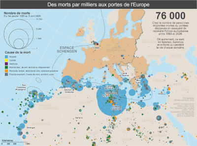 Entre le 1er janvier 1993 et le 3 avril 2026, 76 000 personnes sont mortes en migration en tentant de rejoindre l’Europe. Noyades, asphyxies, accidents, écrasements, empoisonnements, explosions sur des champs de mines, morts de faim, de soif, d’épuisement, absence de soins médicaux ou encore violences policières, autant de tragédies humaines qui sont le fruit des politiques migratoires répressives.