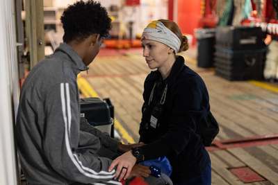Lorsque les collègues des canots de sauvetage m’ont appelée sur le navire pour me dire qu’un brancard était nécessaire, j’étais plutôt surprise : nous n’avions identifié aucune personne rescapée nécessitant des soins médicaux au moment de la stabilisation.