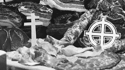 « Il s’agit de traditions complètement fantasmées par l’extrême droite. On ne mangeait pas autant de viandes avant, pour des raisons économiques évidentes, cela restait réservé aux repas de fête », rappelle Nora Bouazzouni, journaliste spécialiste de l’alimentation (autrice de Mangez les riches : la lute des classes passe par l’assiette, 2023, éditions Nouriturfu et Violences en cuisine, 2025, éditions Stock). « La viande est devenue une arme politique pour l’extrême droite il y a une vingtaine d’années, avec les apéros saucisson pinard et les distributions de soupe aux cochons excluant les musulmans, poursuit-elle. Et après le musulman, un autre ennemi des traditions est arrivé : le vegan, assimilé aux écolos, aux féministes, et aux gauchistes. » La valorisation à outrance de la viande est devenue un sujet politique majeur pour l’extrême droite. (...)