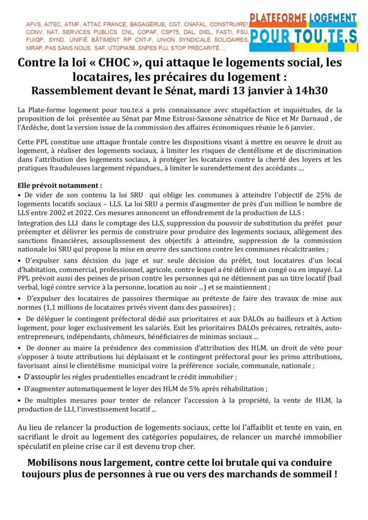 Pour la Confédération Nationale du Logement (CNL), cette loi fragilise plus encore les locataires et le logement social. Est fait le choix politique de privilégier la rentabilité immobilière et le droit de propriété, au détriment du droit au logement alors que 2,8 millions de personnes attendent un logement social : « la crise actuelle n’est pas due à une prétendue sur-protection des locataires, mais au désengagement de l’État, à l’asphyxie du logement social et à la financiarisation du logement. »