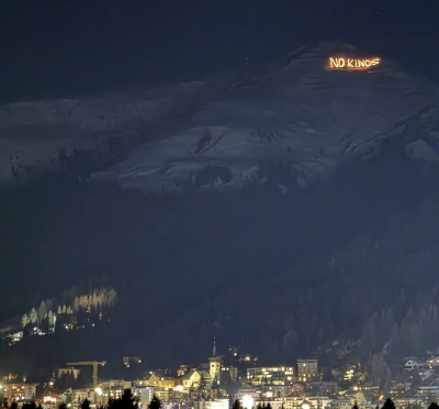 Mardi soir, peu après la tombée de la nuit. Dans les rues de Davos, les passants s’arrêtent, interloqués, lèvent les yeux et sortent leur téléphone pour prendre des photos. Au-dessus de la ville, un message s’embrase dans le ciel : « No Kings ».