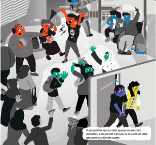 Alors que la brochure tente de brosser un tableau de “grande aventure positive”, les dessins pour ados et mineurs non-accompagnés sont littéralement cauchemardesques. Voyons d’abord le narratif autour de ce moment vécu par les enfants, en toute impuissance. Nous n’allons plus distinguer entre les trois versions car le narratif est identique, il n’y a que le vocabulaire (et encore) qui est adapté.
