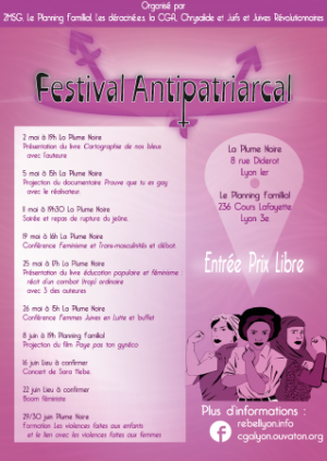 Après une première édition réussie, la CGA Lyon (Coordination des Groupes Anarchistes) avec le Planning Familial, 2MSG (Migrations, Minorités Sexuelles et de Genre), le collectif Des Raciné.e.s, Chrysalides, Juives et Juifs Révolutionnaires présentent la 2ème édition du festival antipatriarcal du 2 mai au 30 juin.