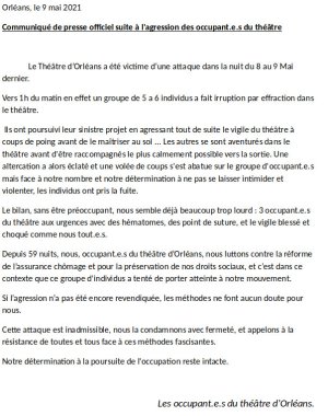 L’agression des occupantes, occupants et intermittents du théâtre d’Orléans dans la nuit du 8 au 9 mai, agression qui a provoqué l’envoi de trois personnes aux urgences, n’intervient pas dans un ciel serein et vient boucler une longue semaine d’actualités locales tendues. (...)