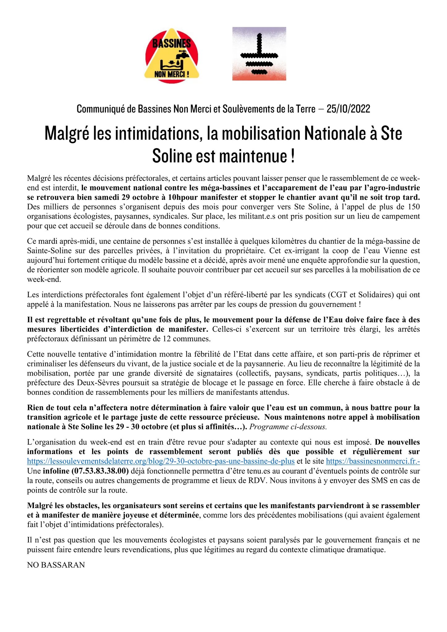 Communiqué commun à Bassines non merci ! et Les Soulèvements de la Terre sur le maintien de la mobilisation du 29 et 30 octobre.