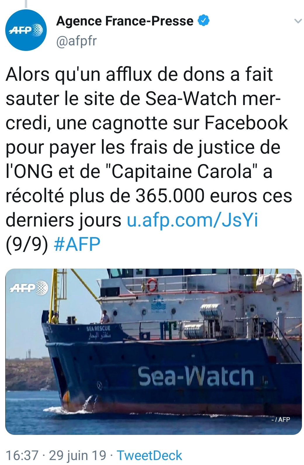 Carola Rackete, capitaine du #SeaWatch3, est l’honneur de l’Europe, et @matteosalvinimi entraîne toute l’Europe dans le déshonneur. Si respecter le droit de la mer et les droits des gens est condamné, il nous faudra bien choisir la désobéissance civile, au nom des droits humains. (...)
