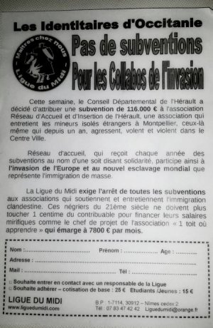 Ce vendredi 30 juin le local de l’association Réseau d’Accueil et d’Insertion de l’Hérault (RAIH) a reçu la visite virile d’une dizaine de militants de la Ligue du Midi.Les identitaires d’Occitanie ont, ainsi, manifesté contre les subventions publiques attribuées aux associations "pour l’accueil des immigrés clandestins et notamment les mineurs isolés étrangers." (...) A dix heures du matin, une dizaine de personnes pénètrent dans le local de l’association Réseau d’Accueil et d’Insertion de l’Hérault situé rue Castilhon. En l’espace de quelques instants, le local est mis sens dessus dessous et les papiers volent dans tous les sens (...)