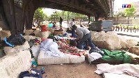Porte d’Aubervilliers l’ambiance est différente, familiales aurais-je envie de dire. Il y a deux grands campements le long des rampes qui relient la place au périphérique. Ici tout est calme. On peut voir qu’il ne reste pas un centimètre carré de disponible, le lieu est bondé, des tentes vertes et bleues sont collées les unes aux autres, des vêtements sèchent ici et là. Des hommes mendient au feu de signalisation. Deux cabines de toilettes en plastique sont placées devant chaque camp. Ce qui évidemment est cruellement insuffisant. Et pourtant les hommes et les femmes que nous appelons « migrants » se débrouillent pour maintenir leur hygiène. (...)