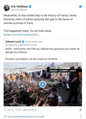 “On n’est pas supposé utiliser ce genre d’instruments à moins d’un mètre et on est censé l’utiliser pour disperser des manifestations violentes, pas des mouvements pacifistes, a déclaré à l’AFP Cyril Dion. La disproportion de la réponse policière est folle”.