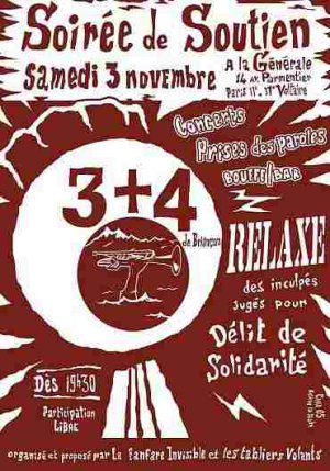 Pour les aider à subvenir à leurs frais de justice et lancer un message fort de solidarité et d’humanité, La Fanfare Invisible, Les Tabliers Volants, Chez les Croquignards, La Cimade, le Gisti, #Délinquantssolidaires, l’Anafé et le Comité de soutien au 3+4 de Briançon organisent, le samedi 3 novembre, à partir de 19h30, une soirée de soutien à La Générale Nord-Est à Paris. (...)