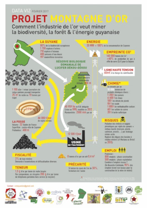 2,5 km de long, 500 m de large et 400 m de profondeur. C’est une immense fosse que prévoit de creuser la compagnie russe Nordgold sur le site de la Montagne d’or, dans l’ouest de la Guyane, après que des travaux de prospection y aient été menés par la junior canadienne Columbus Gold. Actuellement dominé par une exploitation artisanale, légale et illégale, et par quelques structures semi-industrielles, le domaine minier guyanais basculerait alors dans une exploitation industrielle de l’or orchestrée par des multinationales. Si ce projet voit le jour, ce serait la plus grande mine d’or exploitée en France. C’est de cela que les organisations qui composent Or de question ne veulent pas et les raisons à cette opposition ne manquent pas. (...)
