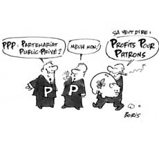 Un nouveau sigle commence à connaître une certaine renommée du type ANPE, PACS ou CAE ! Le PPP nous est « balancé » dans beaucoup de réunions publiques où des élus veulent nous inculquer les nouveaux modes de gestion de l’Etat, mais que se cache-t-il derrière ce sigle ? Ce n’est pas un nouveau gaz rare responsable de l’effet de serre, ni le nouveau parti à la mode. Non, c’est la façon distinguée de dire : désengagement de l’Etat au profit de grands groupes privés !