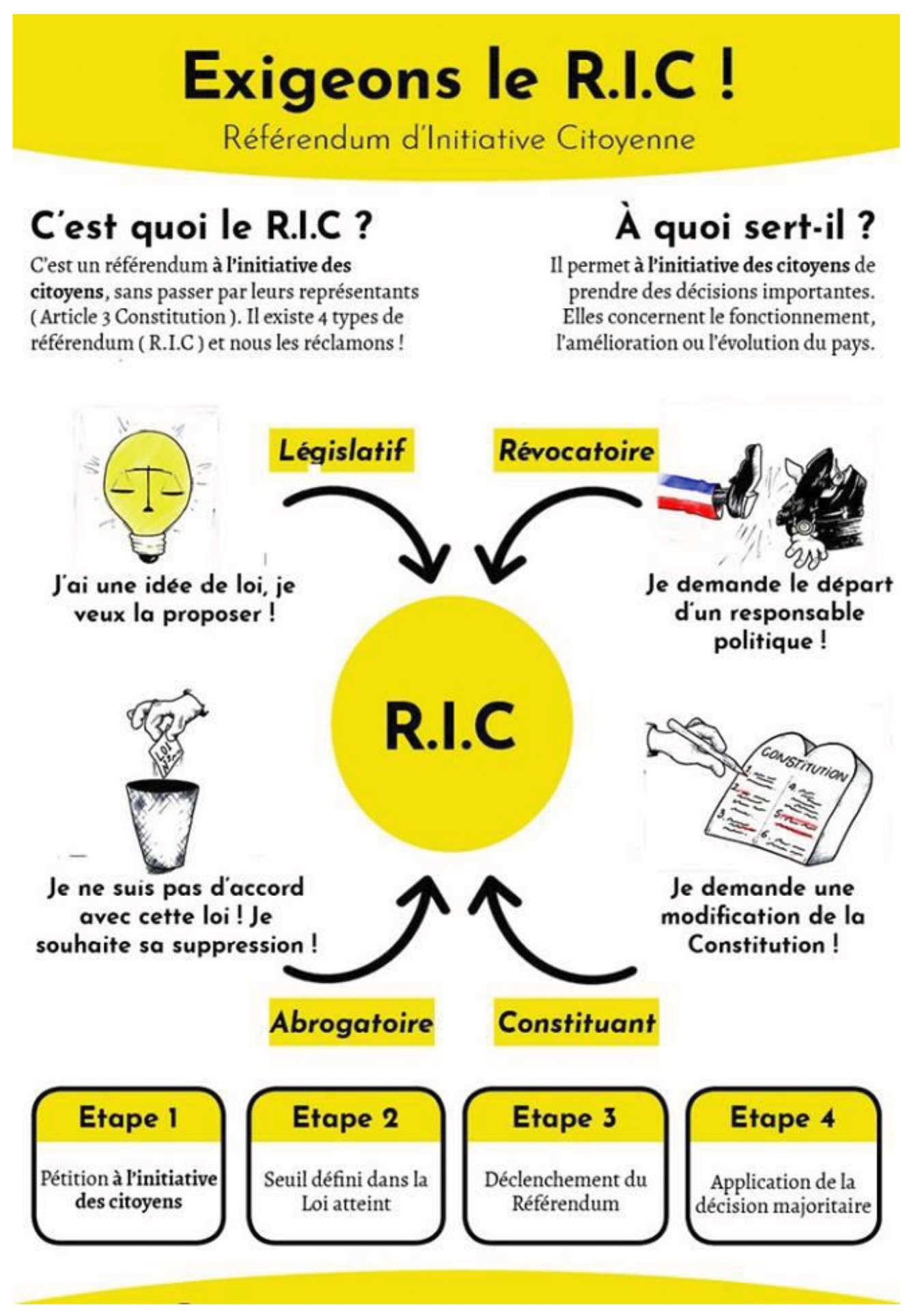 Fort de ce constat, une des 42 revendications des Gilets Jaunes, le Référendum d’Initiative Citoyenne (RIC) en toutes matières, devient la revendication principale. C’est LA mesure qui permet d’obtenir toutes les autres, démocratiquement, sans importuner une partie du peuple, sans manifestation comme seul moyen d’expression. Le RIC répond à l’aspiration démocratique du peuple, qui le soutient très majoritairement dans les sondages (de 60 à 90% d’avis favorables). Le principe du RIC EN TOUTES MATIERES est le suivant (voir schéma ci-joint) : A l’initiative des citoyens, un référendum législatif, abrogatoire, révocatoire ou constituant peut être déclenché.