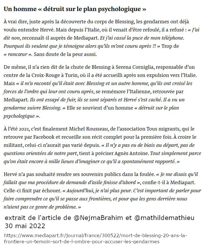 "Je l’ai entendue crier : ’Help me, help me !’ [’Aidez-moi, aidez-moi !’] Au fur et à mesure qu’elle criait, sa voix s’éloignait… Ensuite, le gendarme est allé dire à ses collègues qu’elle était tombée dans la rivière mais qu’elle avait peut-être traversé. Ils n’ont pas appelé les secours. Des gendarmes sont allés [essayer de] chercher Blessing de l’autre côté", avait confié Hervé S. à Médiapart qui l’avait rencontré et interrogé en avril dernier.