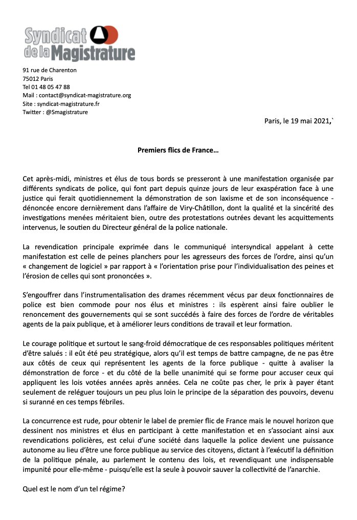 communiqué de presse du Syndicat de la Magistrature relatif à la participation d’élus et de ministres à la manifestation à l’appel de syndicats de police