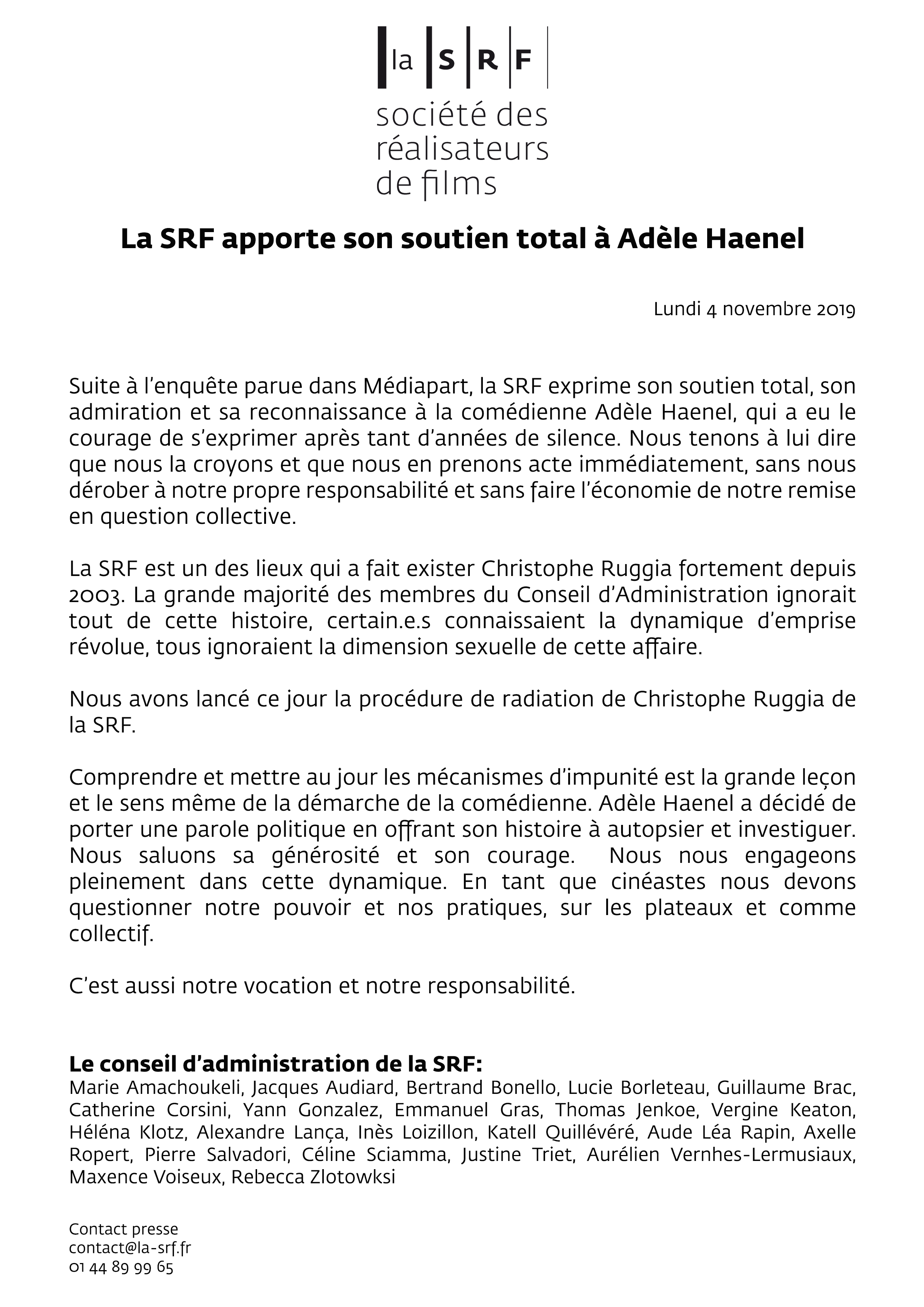 Ce travail se poursuit lundi 4 novembre, avec une émission à 19 heures, sur le sujet. Adèle Haenel sera notre invitée, ainsi que la critique et universitaire Iris Brey, spécialiste de la représentation du genre et des sexualités dans le cinéma. Nous avons proposé à Christophe Ruggia de s’exprimer à son tour s’il le souhaitait, dans notre émission de mercredi 6 novembre.