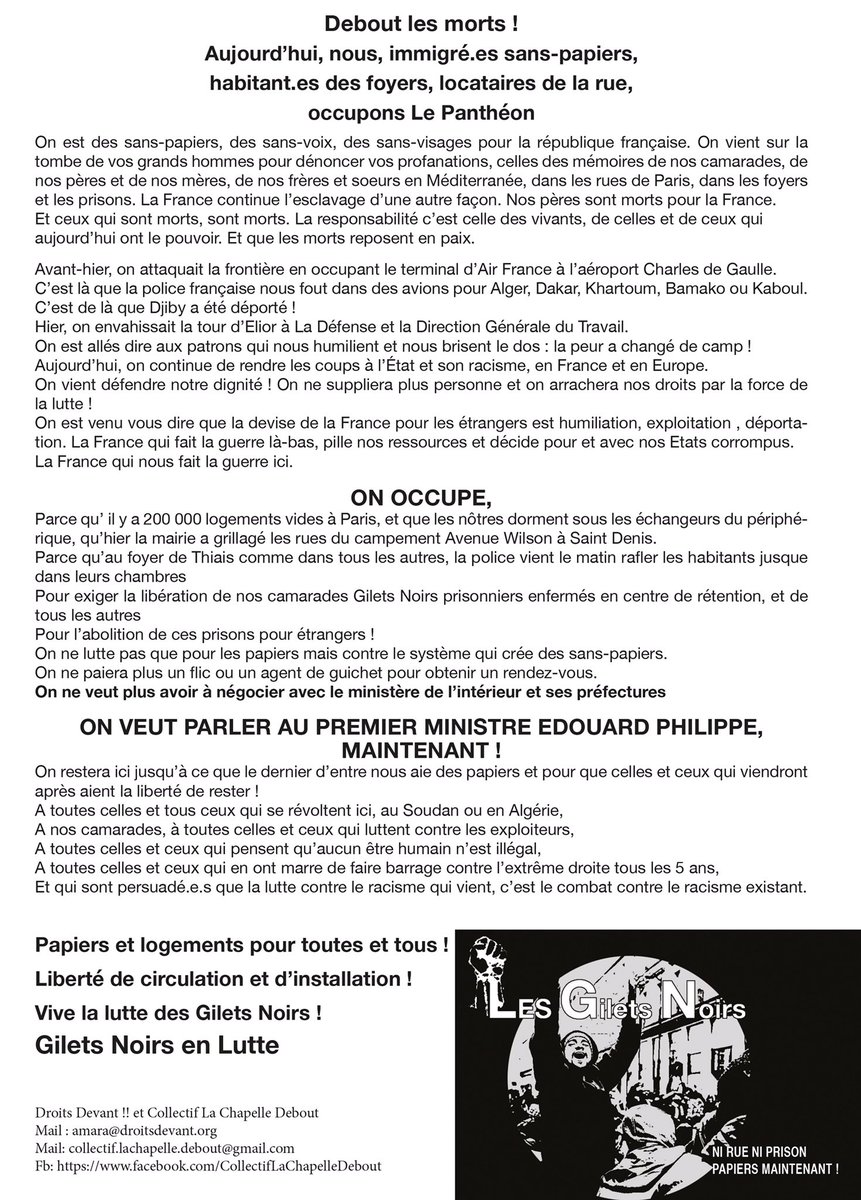 Soutien aux #GiletsNoirs qui ont oc’cupé le Panthéon ajd pour réclamer la régularisation des sans-papiers & protester contre l’exploitation & la répression qui les visent. Une action symbolique puissante qui s’achève avec plusieurs blessés suite aux charges violentes de la police. https://t.co/C52TbtnaDH