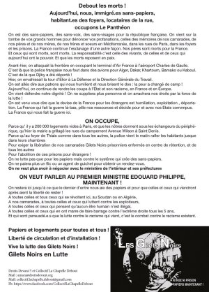 Environ 1000 manisfestants occupent le Panthéon depuis la mi-journée. Ils réclament la reconnaissance de leur droit, des papiers et des logements pour tous. Ils se déclarent déterminés et menacent de ne pas vouloir quitter le monument tant qu’ils n’auront pas été reçus par le premier ministre, Edouard Philippe.