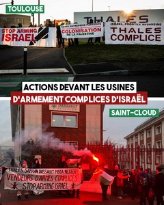 À Toulouse, une trentaine de personnes se sont rassemblées devant le site de Thalès à Toulouse pour déployer des banderoles « Stop arming Israel », « Israël, Frontex assassins : Thalès complice » et « Cette entreprise participe à la colonisation de la Palestine » (...)