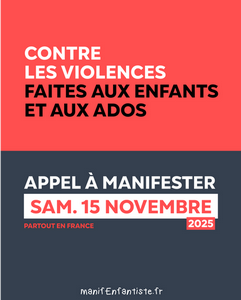 Nous, jeunes personnes, collectifs, associations, syndicats, professionnel·les, militant·es, victimes et survivantEs, appelons à une manifestation nationale et générale contre les violences faites aux enfants et aux ados, le samedi 15 novembre 2025 à 14h, partout en France.