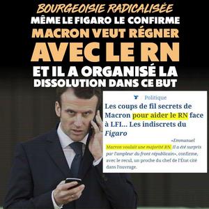 Le 14 juin 2024, Le Monde révélait cet échange de Macron avec un « grand patron, familier de l’Élysée » qui lui avait demandé à propos de la dissolution : « Pas trop dures, ces journées ? » Réponse de Macron, amusé : « Mais pas du tout ! Je prépare ça depuis des semaines, et je suis ravi. Je leur ai balancé ma grenade dégoupillée dans les jambes. Maintenant on va voir comment ils s’en sortent… » En juillet, la presse révélait même l’existence de dîners secrets entre des macronistes et le Rassemblement National avant la dissolution et les élections, manifestement pour se préparer ensemble à gouverner le pays après la dissolution.