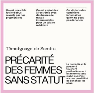 « Des milliers de personnes atterrissent au Canada en quête d’une vie meilleure. On se retrouve vite rejetées par le système d’immigration qui nous ferme toutes les portes pour devenir rapidement des sans statuts.