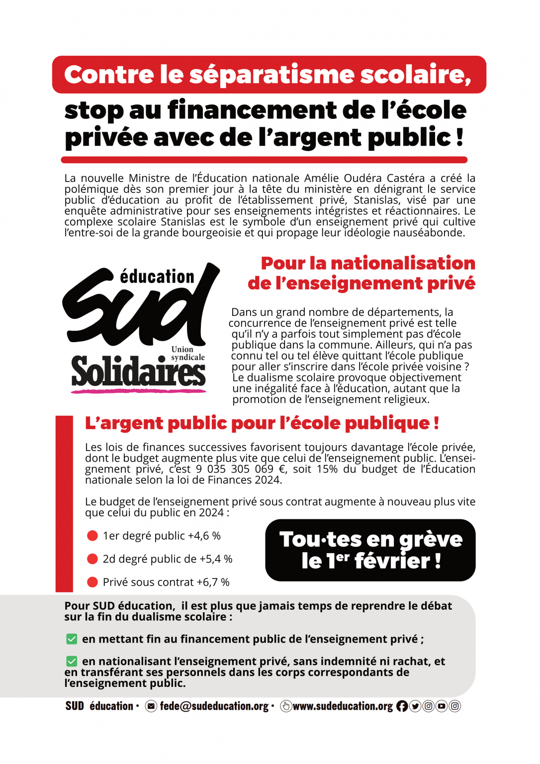 La nouvelle Ministre de l’Éducation nationale Amélie Oudéra Castéra a créé la polémique dès son premier jour à la tête du ministère en dénigrant le service public d’éducation au profit de l’établissement privé, Stanislas, visé par une enquête administrative pour ses enseignements intégristes et réactionnaires. Le complexe scolaire Stanislas est le symbole d’un enseignement privé qui cultive l’entre-soi de la grande bourgeoisie et qui propage leur idéologie nauséabonde.