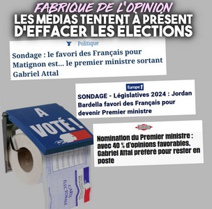 Nouvelle opération concertée des médias dominants : et si, en dépit des résultats des élections, Macron nommait un premier ministre de droite ou d’extrême droite ? Pourquoi pas, c’est ce que prétendent les sondages après tout. En d’autres termes, et si on se passait d’élections ?