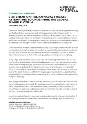 Alors que la flottille s’apprête à entrer dans les eaux territoriales de Gaza avec sa cargaison humanitaire, le gouvernement italien se prépare à l’abandonner, laissant le champ libre à une nouvelle violation israélienne, qui lui permettra de poursuivre son génocide sans être inquiété.