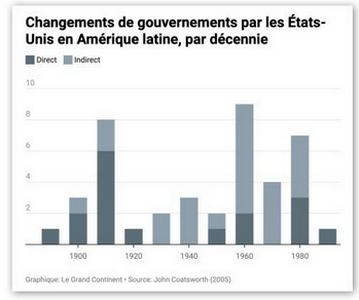 Entre 1898 et 1994, les États-Unis sont intervenus à 41 reprises en Amérique latine pour provoquer des changements de gouvernement, selon un décompte réalisé par l’historien John Coatsworth. Parmi ces interventions, 17 étaient directes (financement de groupes armés, déploiement de forces américaines…) et 24 indirectes — soit lorsque le gouvernement en place aurait probablement survécu en l’absence « d’hostilité » américaine