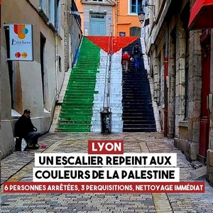 Dans le centre-ville de Lyon, comme à Marseille et à Paris il y a quelques jours, un escalier a été repeint aux couleurs de la Palestine. La répression a été immédiate et implacable : 6 personnes ont été arrêtées par la police qui a mené 3 perquisitions dans la foulée. Et pour ne laisser aucune trace de cette solidarité, la mairie « de gauche » a envoyé ses équipes effacer en urgence, cet escalier quelques heures seulement après. (...)